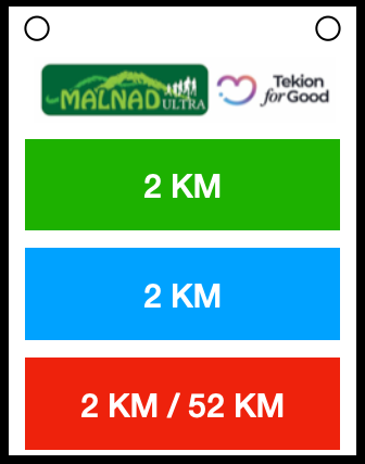 Distance markers are placed at intervals of approximately 2 kms. In general, we use green, blue and red for our 30K, 50K and 100K categories respectively.